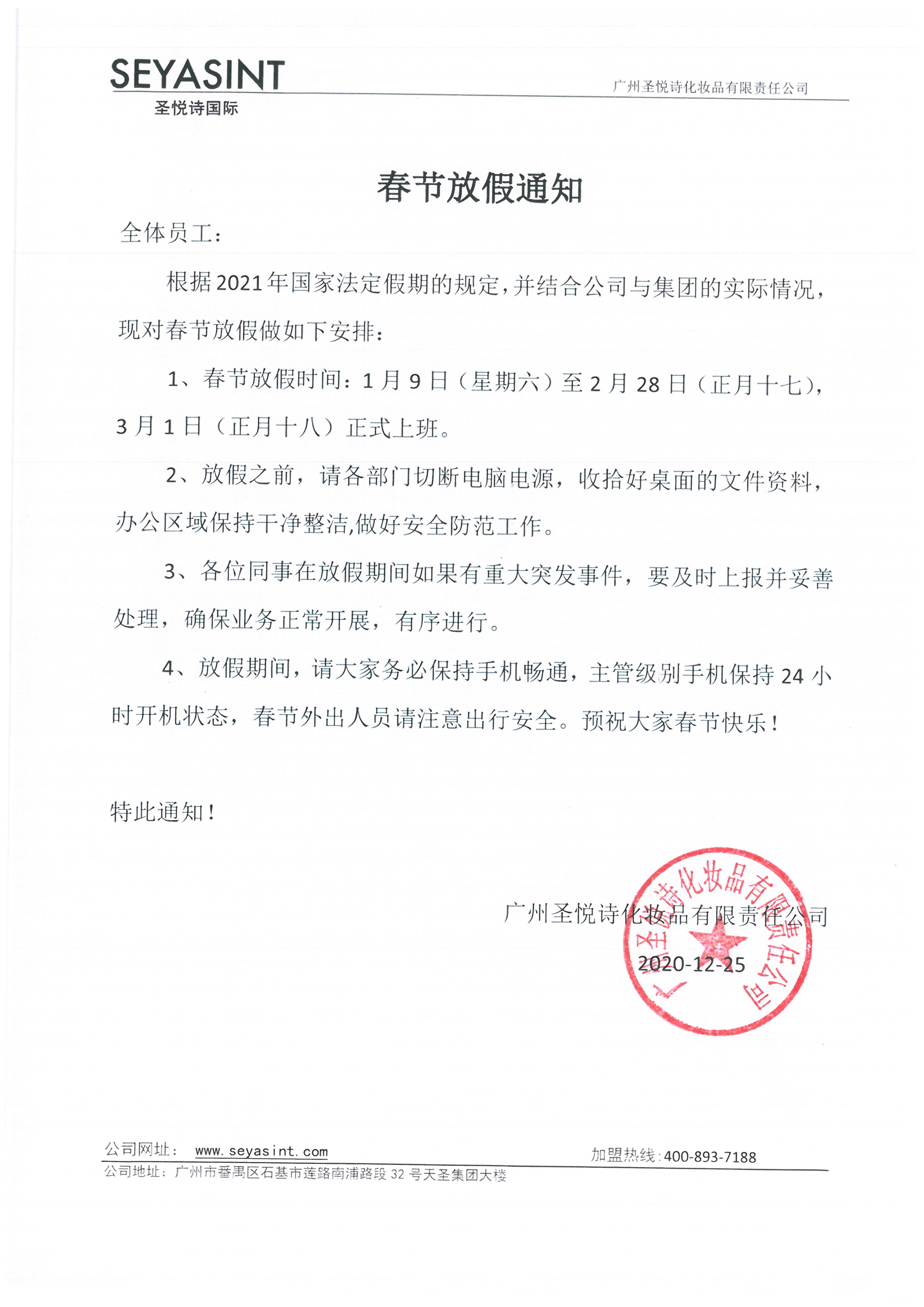 圣悅詩國際美妝中秋國慶放假...